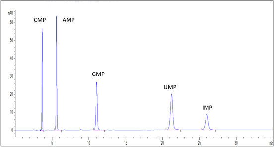 圖1.Venusil ® C18 Plus色譜柱5種核苷酸混標(biāo)高效液相色譜圖