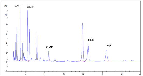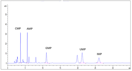 5種核苷酸混合標(biāo)準(zhǔn)溶液:分別稱取核苷酸標(biāo)準(zhǔn)品CMP、AMP、UMP各10mg、GMP、IMP各5mg(精確至0.1mg),用水溶解成并定容至100mL,混勻,即得;