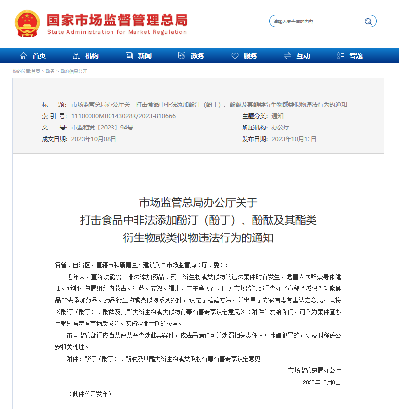 國家市場監(jiān)督管理總局發(fā)布關(guān)于打擊食品中非法添加酚?。ǚ佣。?、酚酞及其脂類衍生物或類似物違法行為的通知,加強(qiáng)了對食品中非法添加的監(jiān)管。