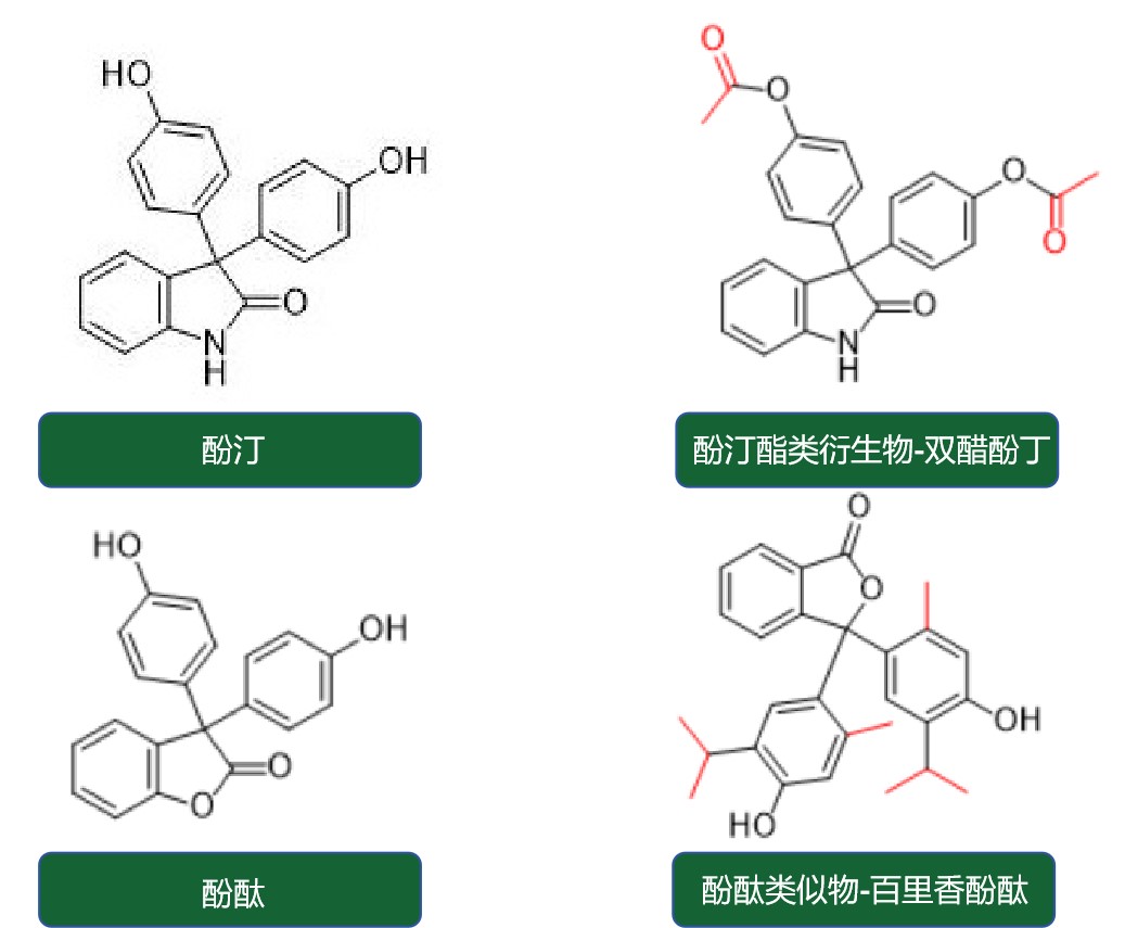 由于酚?。ǚ佣。?、酚酞及其酯類衍生物或類似物與酚酞具有相同/相似的核心藥效團(tuán)和臨床功效,具有類似屬性和危害性,因此,添加有上述物質(zhì)的食品有對人體產(chǎn)生毒副作用的風(fēng)險,影響人體健康,甚至可危害生命。 根據(jù)《食品安全法》,食品不得添加藥物,而該類原料也從未獲得批準(zhǔn)作為食品添加劑或新食品原料,以及保健食品原料,因此,在食品中檢出酚?。ǚ佣。⒎犹捌漉ヮ愌苌锘蝾愃莆铮ㄈ?-氯雙醋酚?。?,均屬于非法添加。